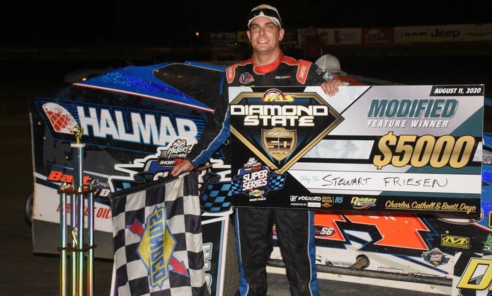 At the end of 50 laps around Delaware International Speedway, Stewart Friesen emerged victorious from Tuesday night’s Hurlock Auto & Speed Supply ‘Diamond State 50’ after a rim-riding performance.